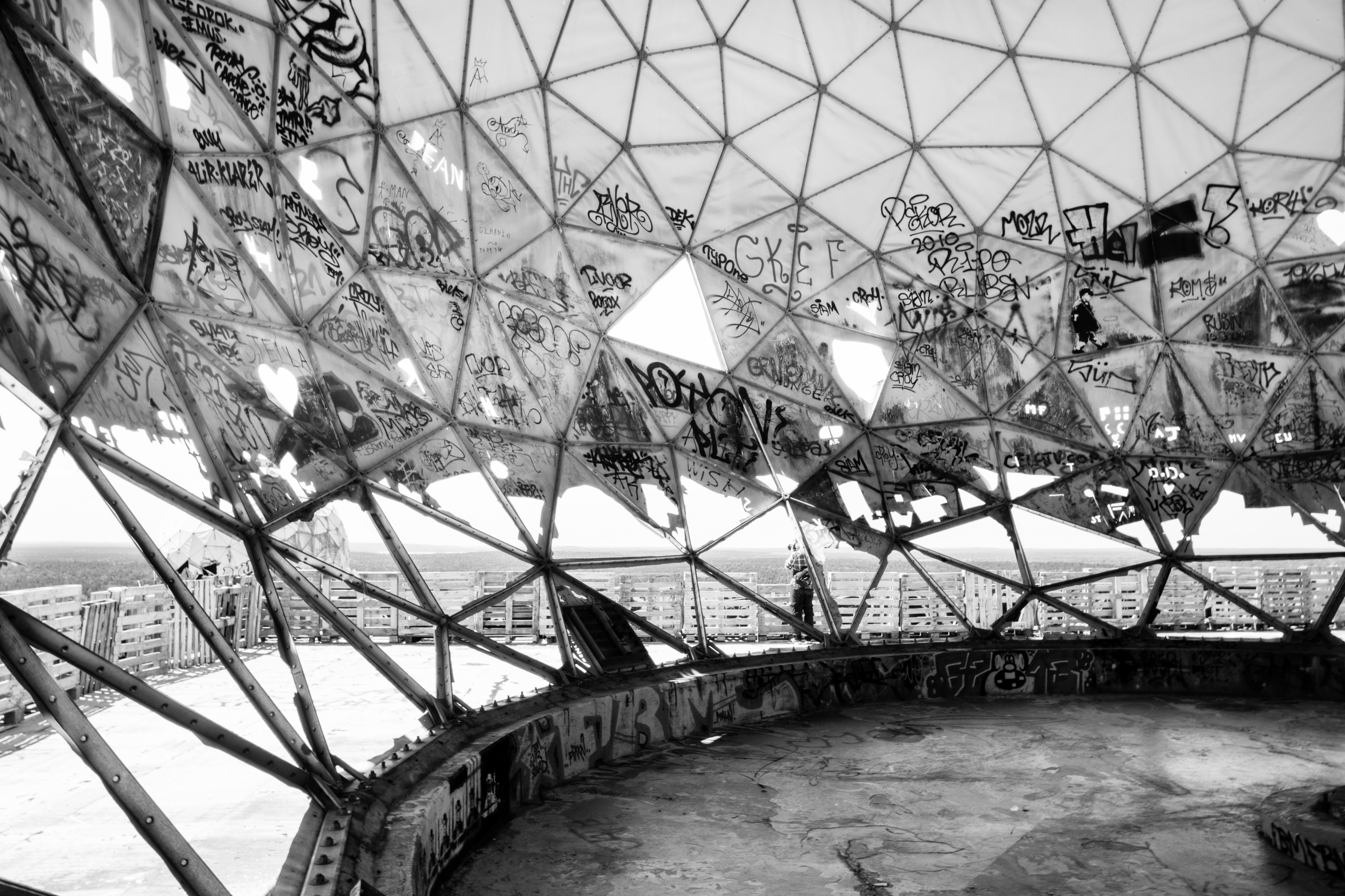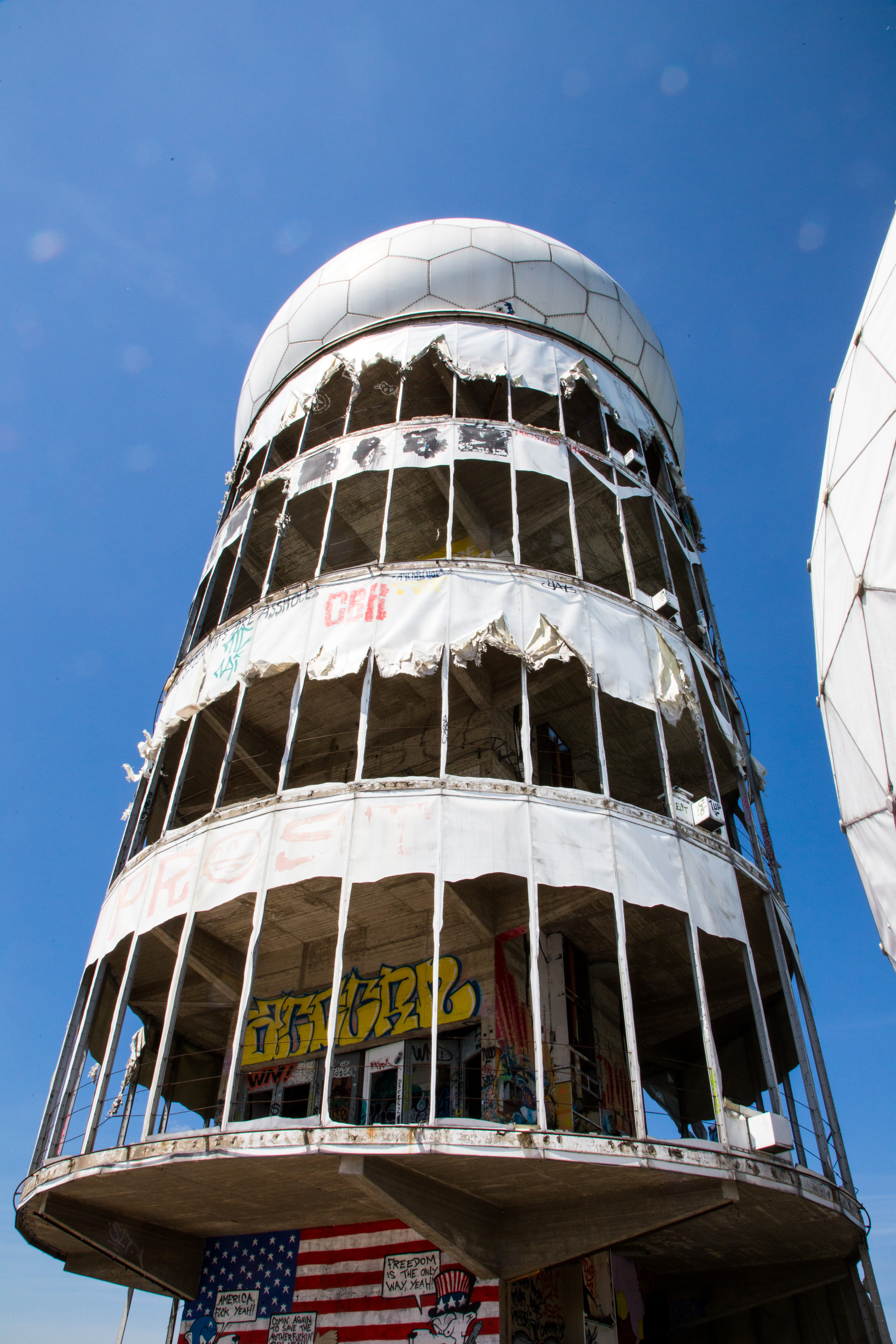 Signs of decay are prevalent throughout the structures and some of it has slowly been reclaimed by the land that surrounds it but it has luckily been left alone as it is. Behold the eerie beauty of a place once used for spying now used for spray painting. Climb the darkened staircases up concrete level after concrete level, graffiti and sweeping views over the dark forest to the city lights out in the distance all around you.