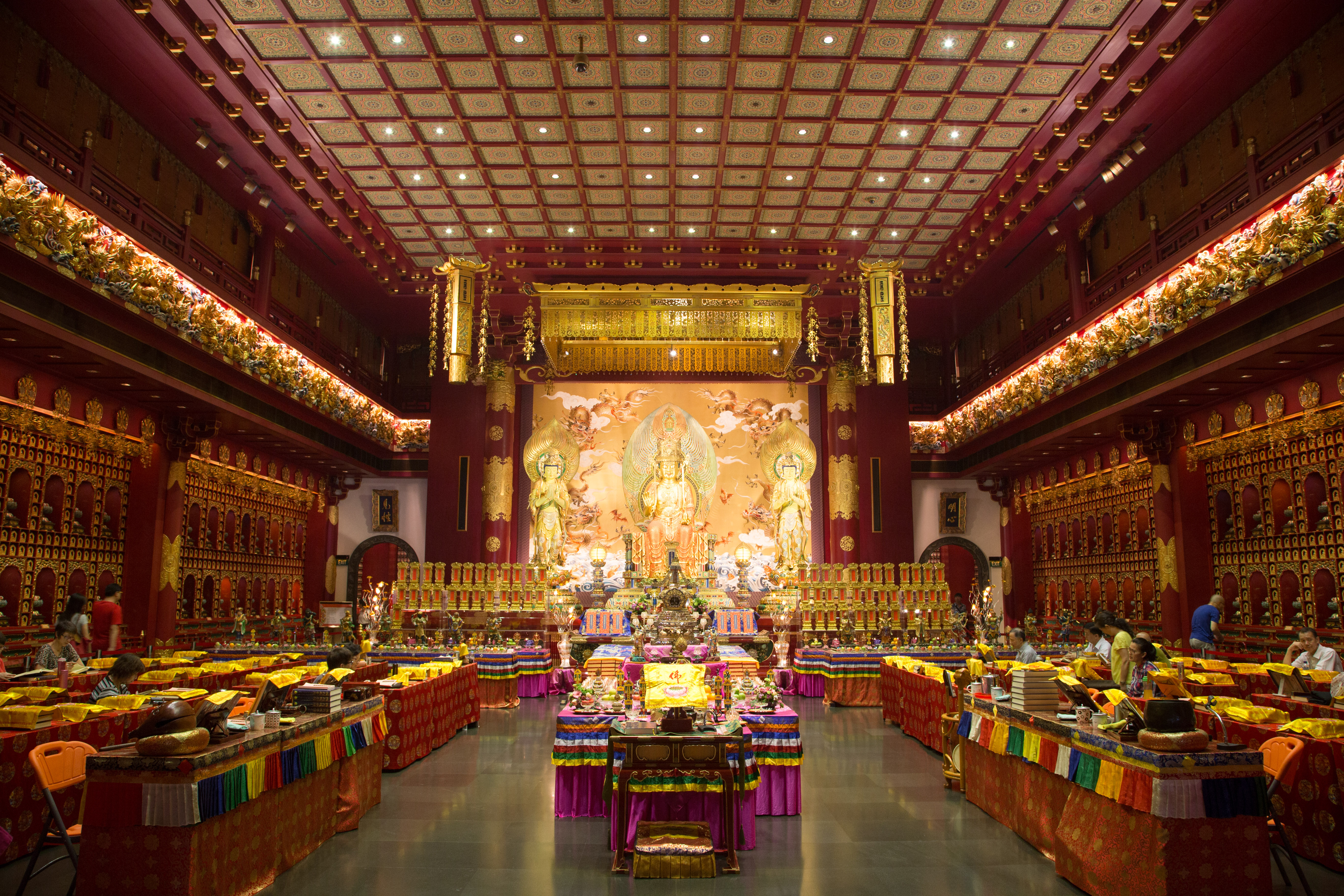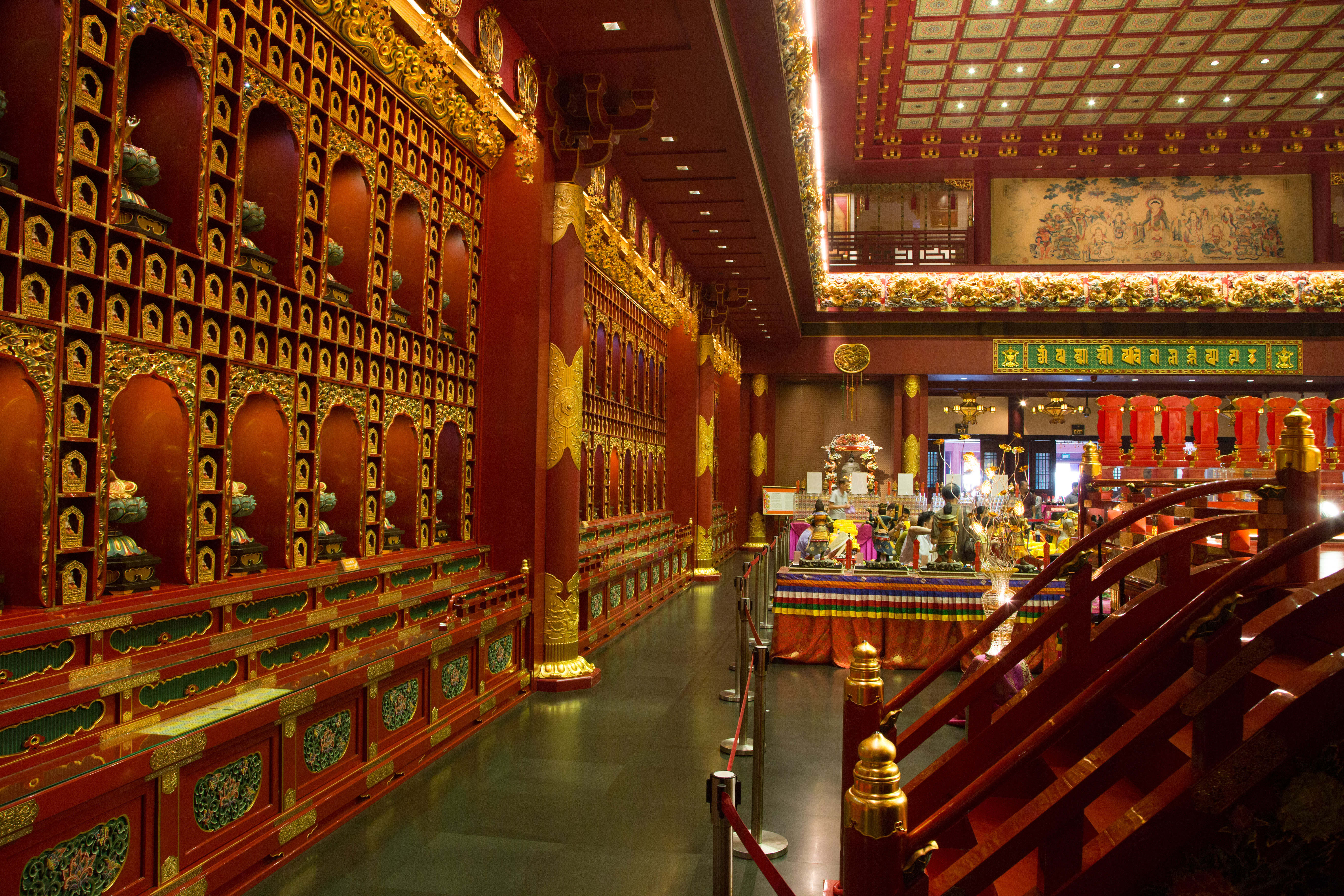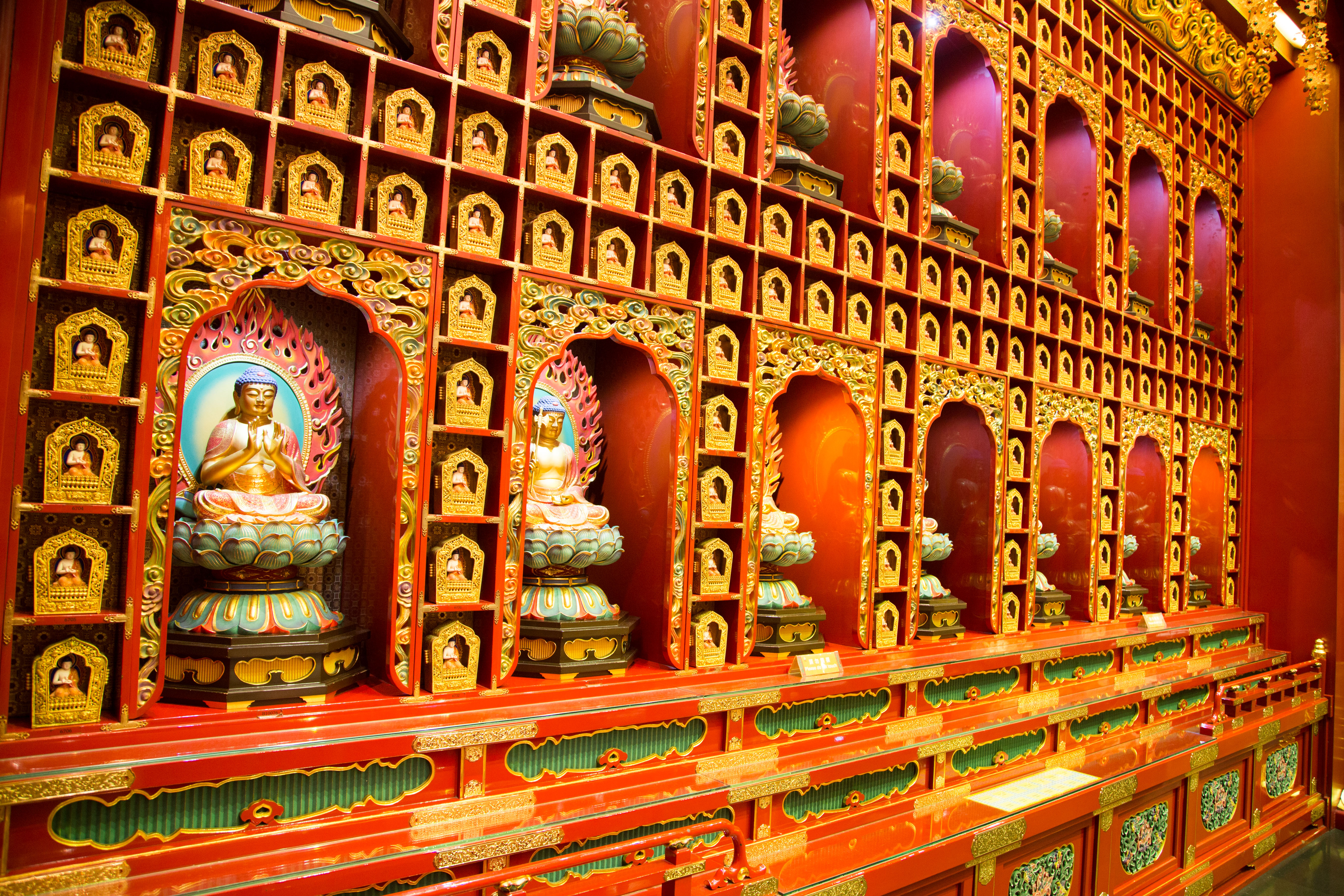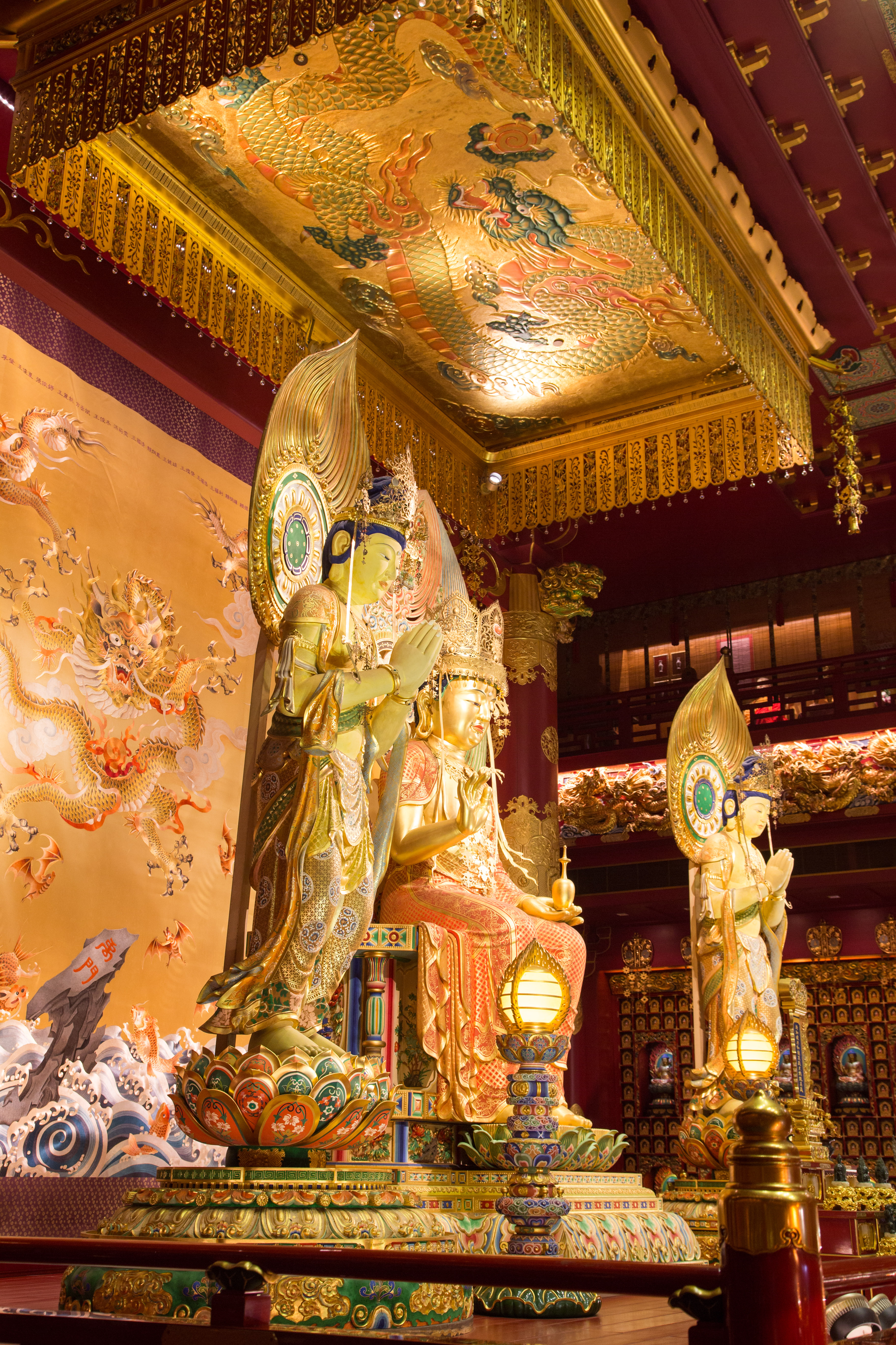 The Buddha Tooth Relic Temple is a Tang Dynasty-style temple housing religious relics and has ornate rooms.