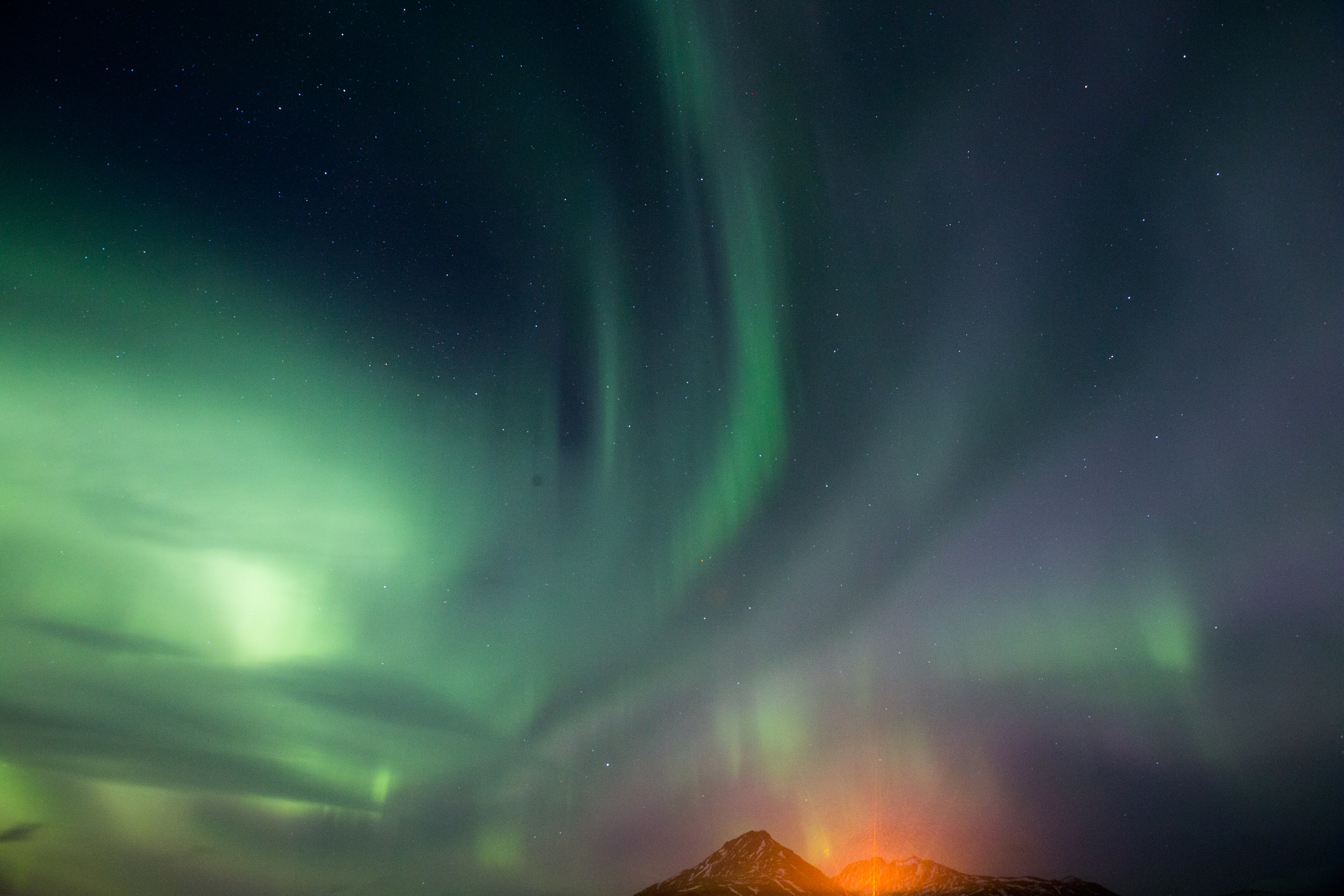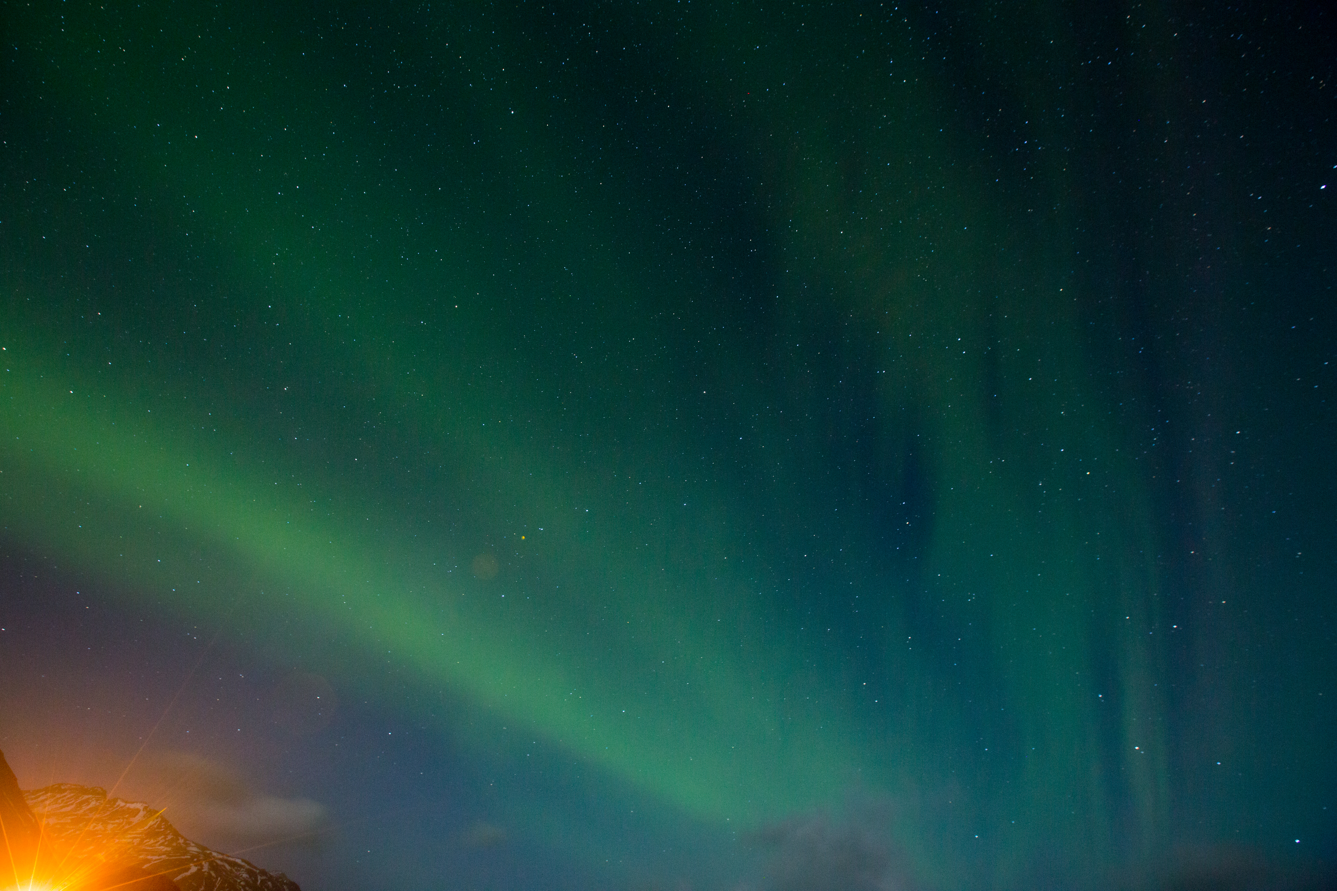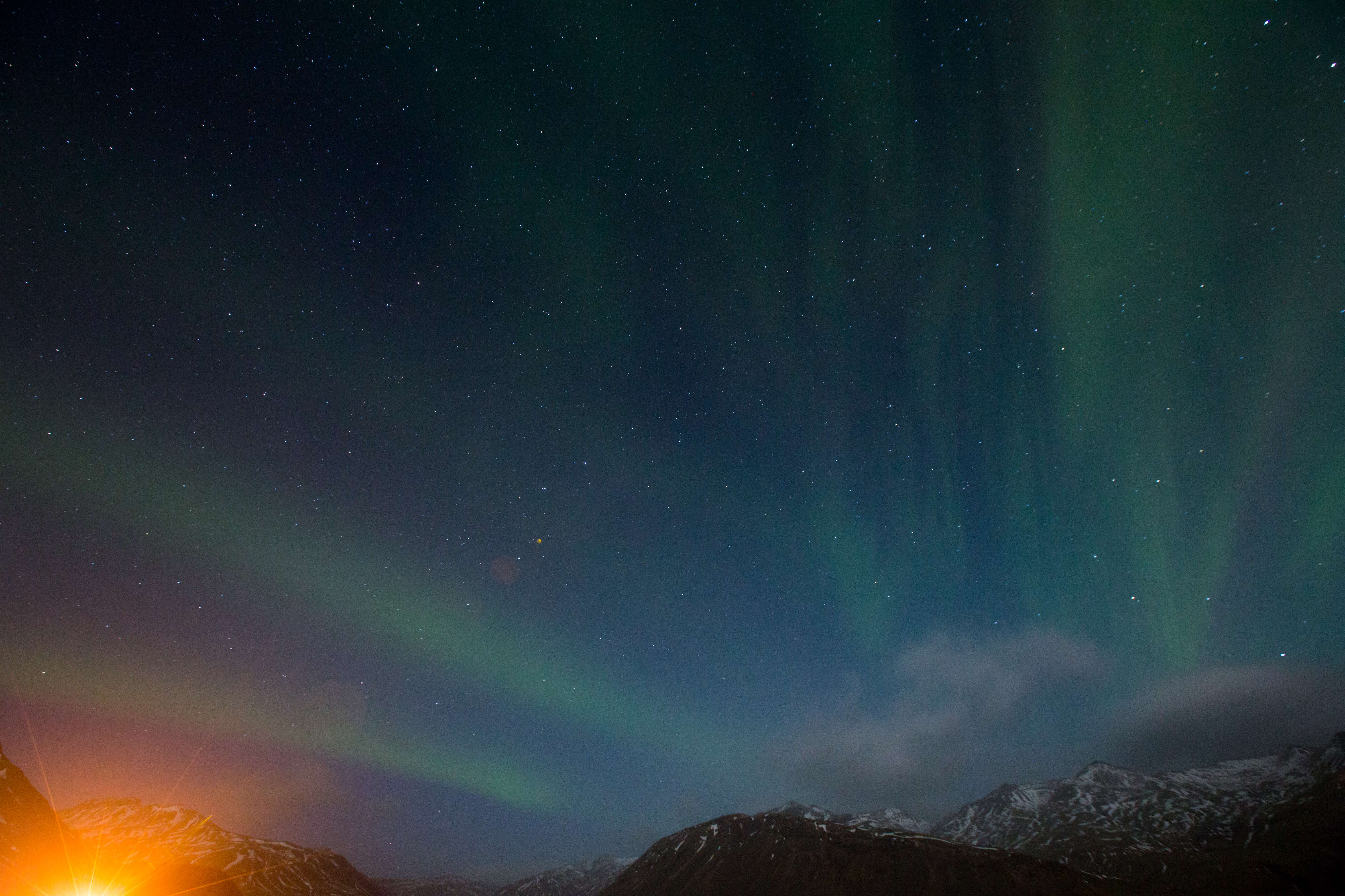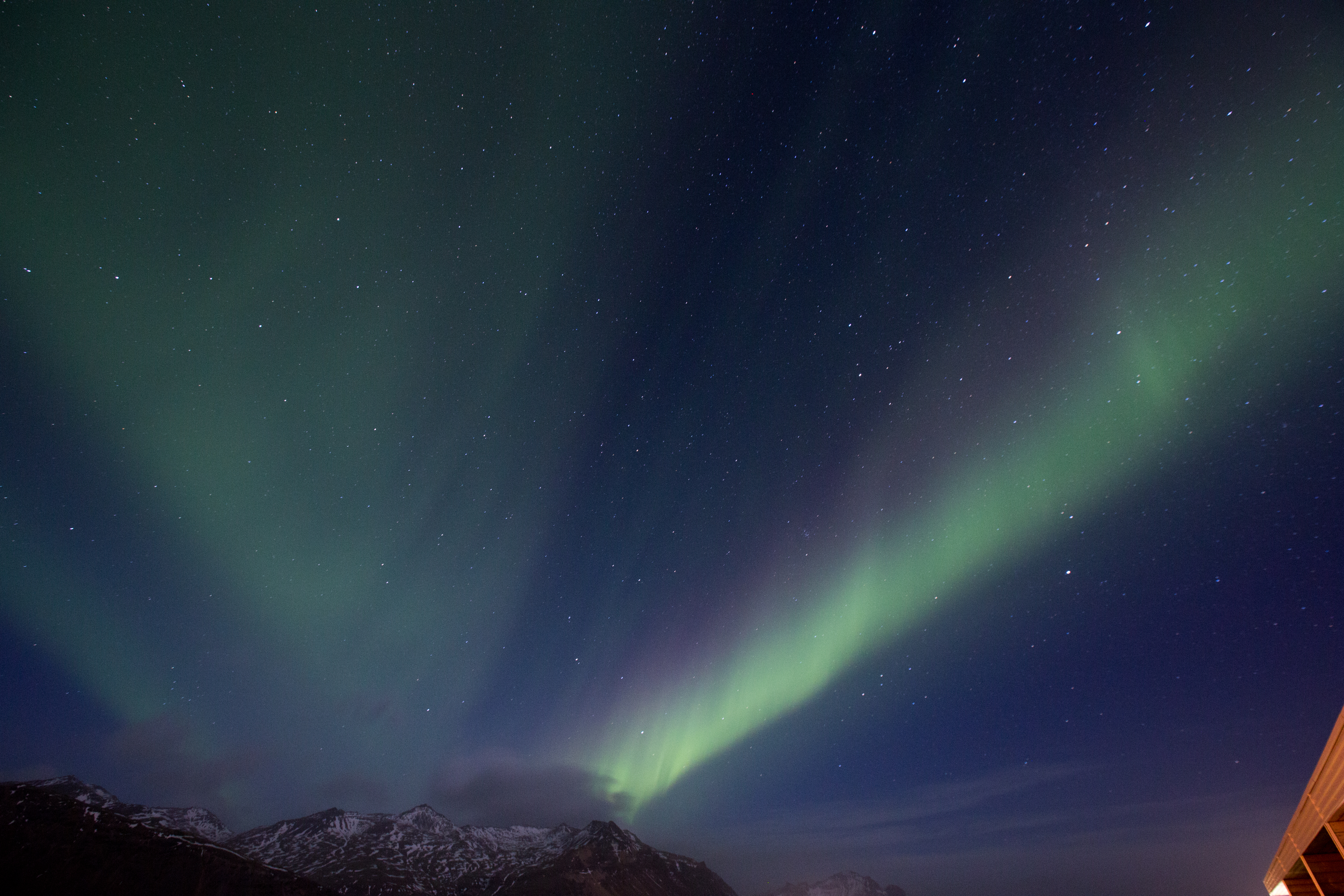 A few hours later I heard a great commotion outside my room. Out of nowhere, the northern lights were cresting the nearby mountain right outside my room. Everyone was outside my room excitedly watching this amazing and unexpected show. At first, the lights were just a dull green. Over time they grew to a more vivid green easily seen by the naked eye. As they stretched across the sky they started to dance and hues of purple started splitting from the green. For over an hour we all sat outside our rooms as we watched the brilliant display. It was such an amazing show that one of the couple promptly cancelled their Northern Lights tour that was planned for the next night.