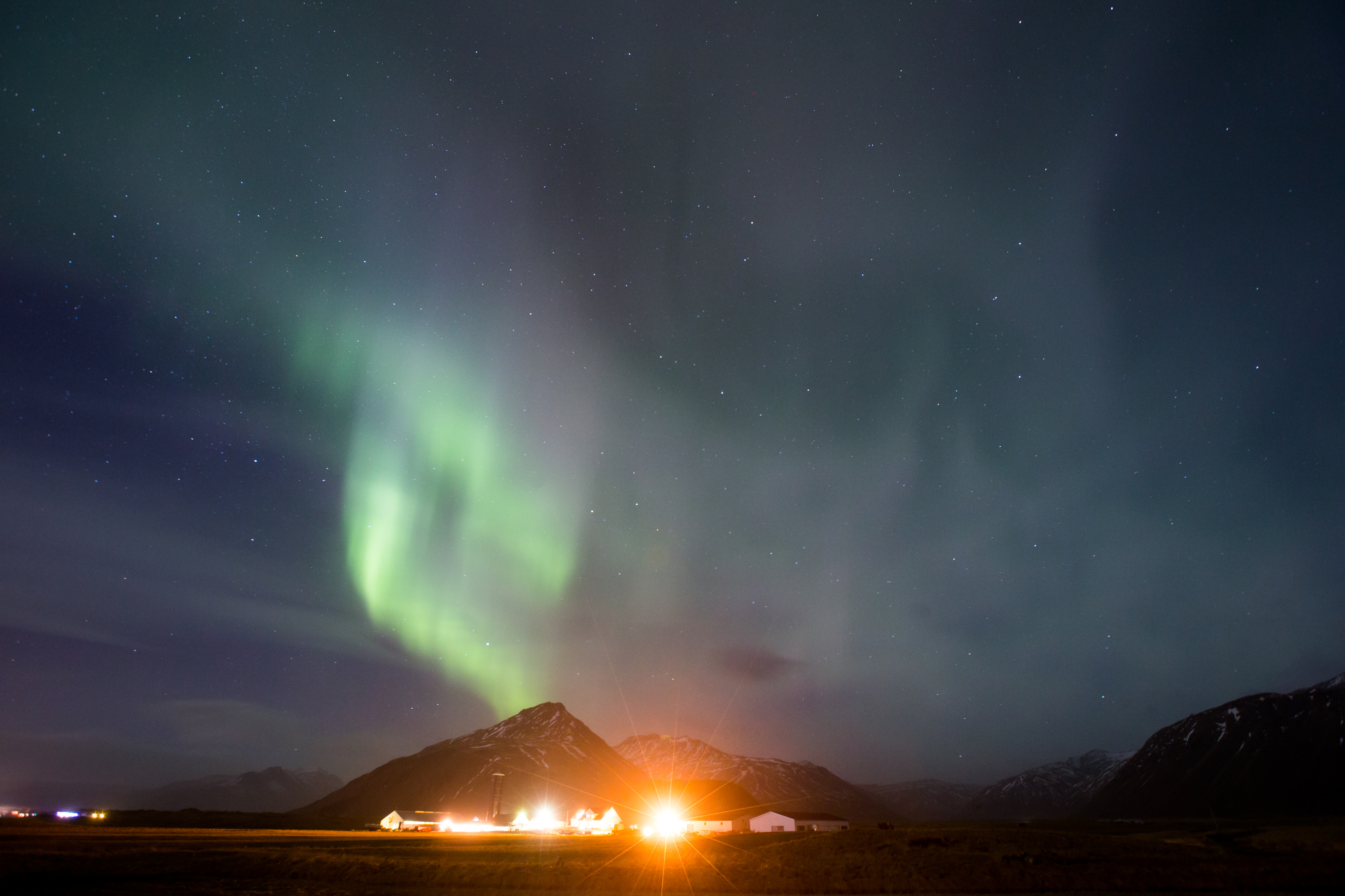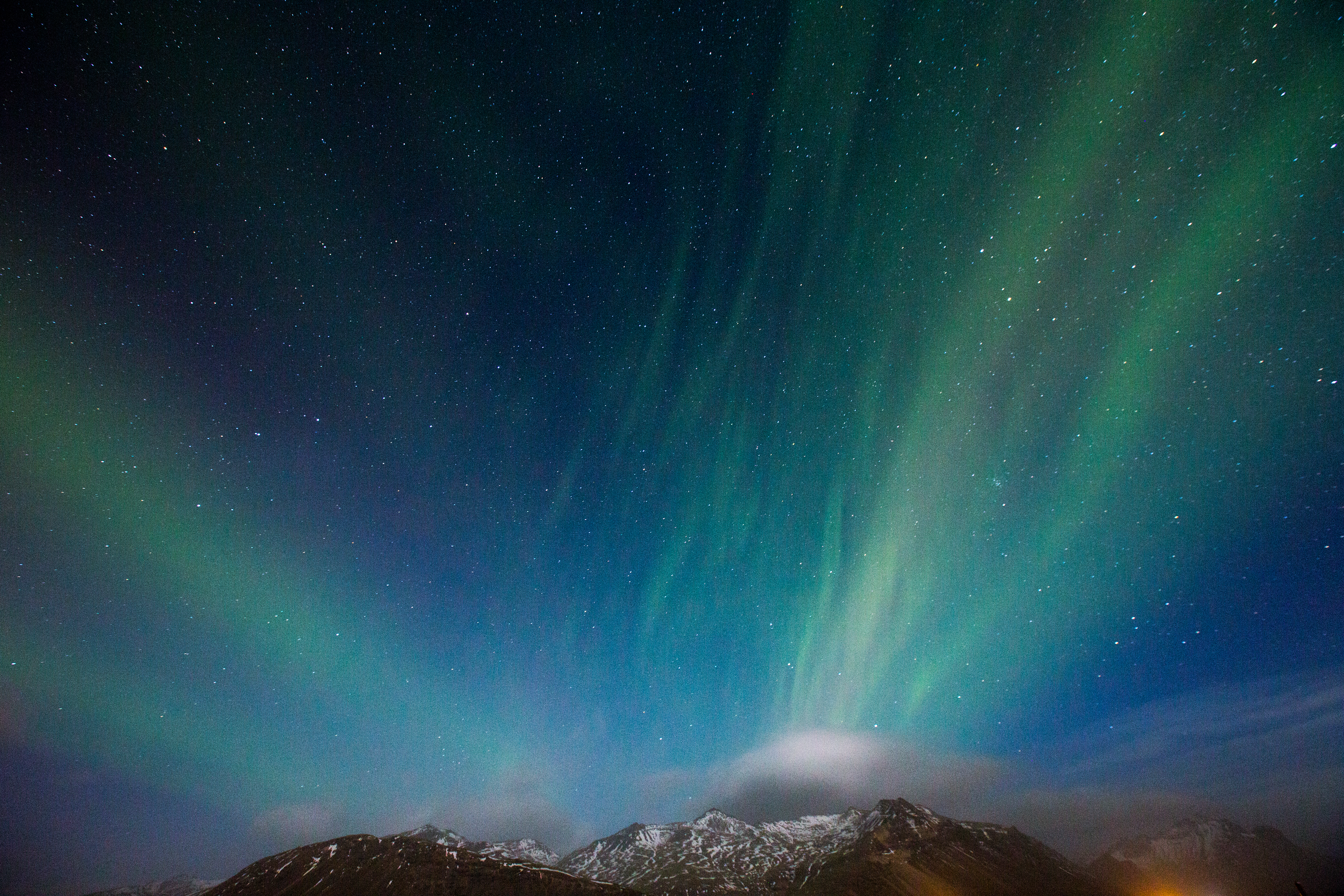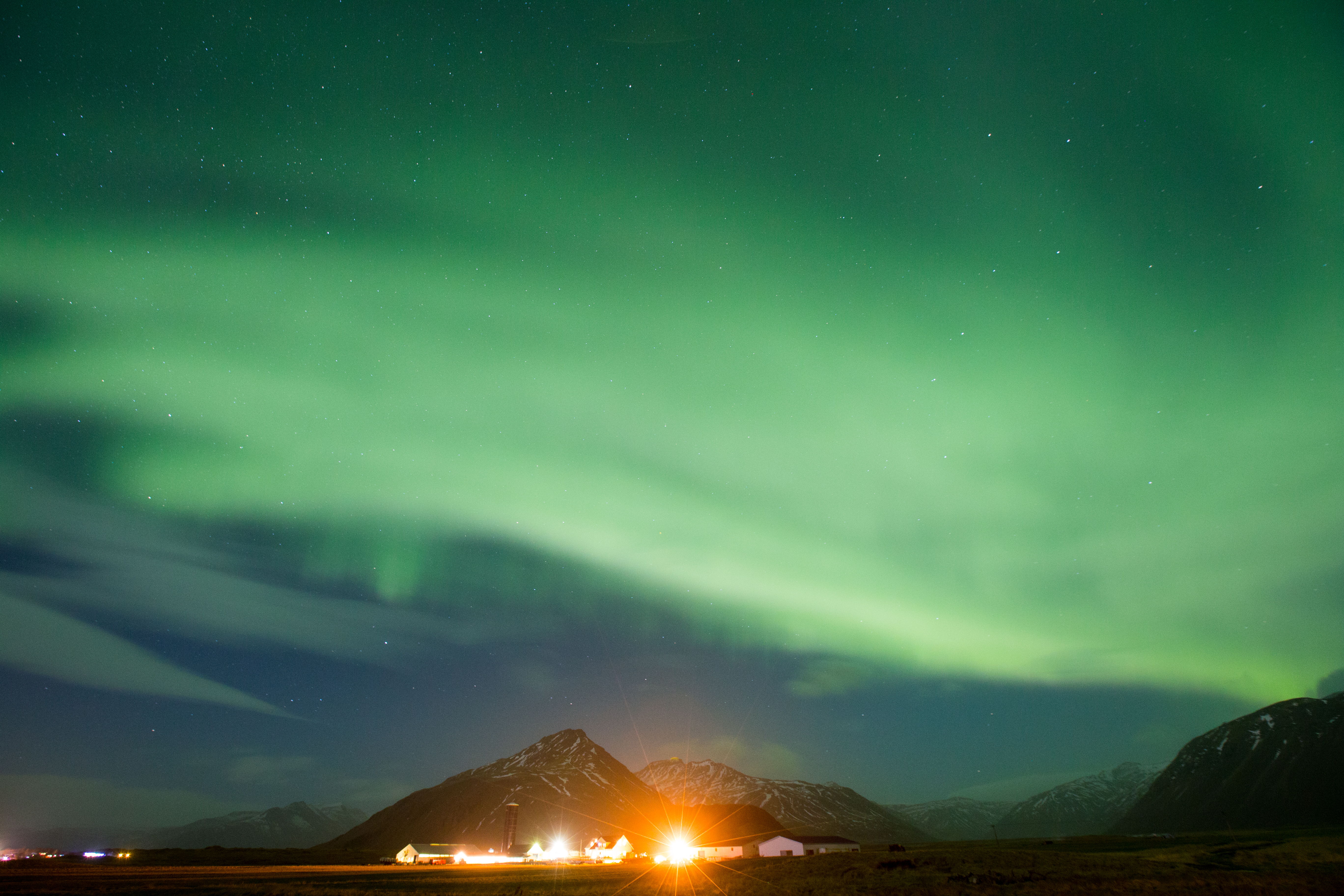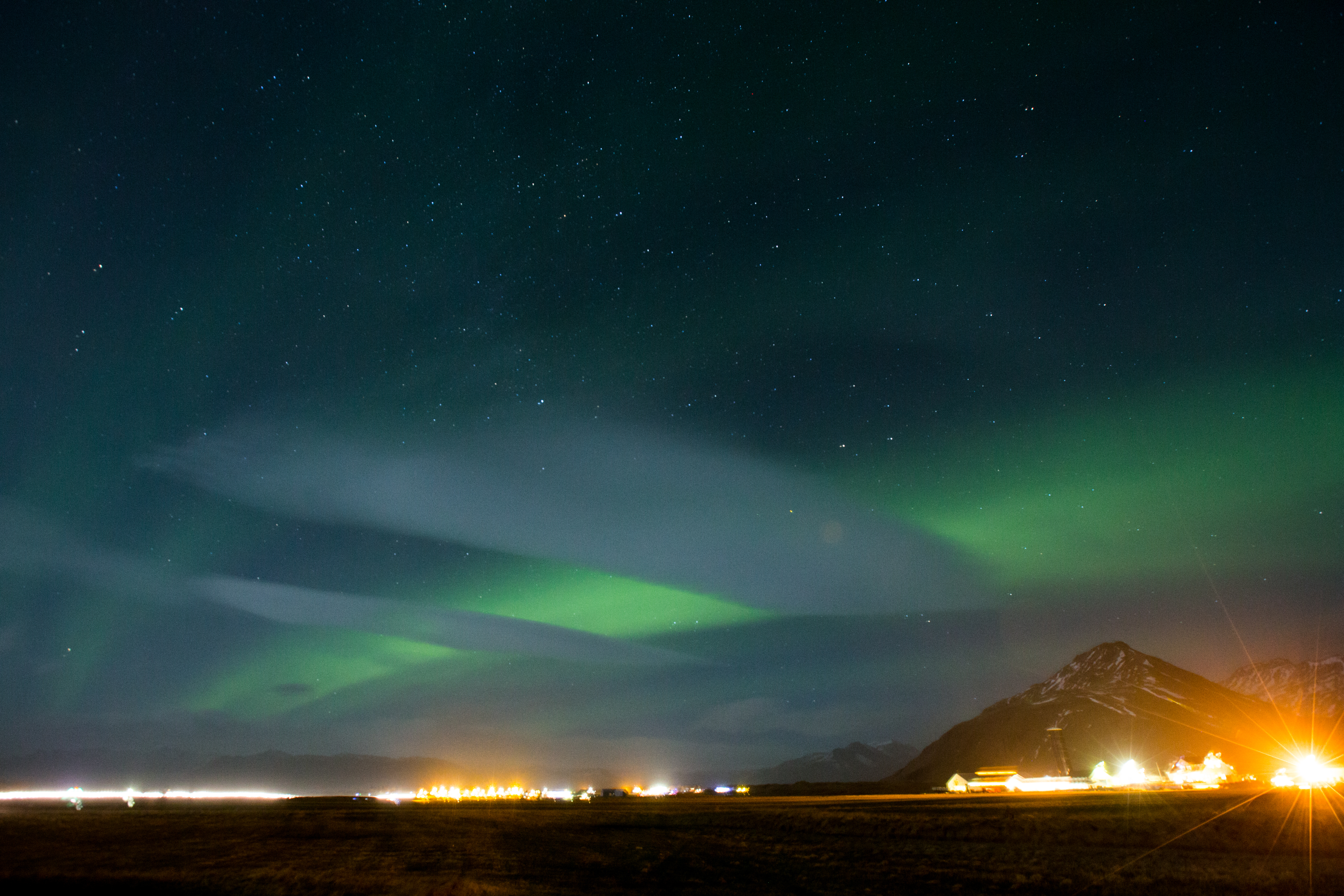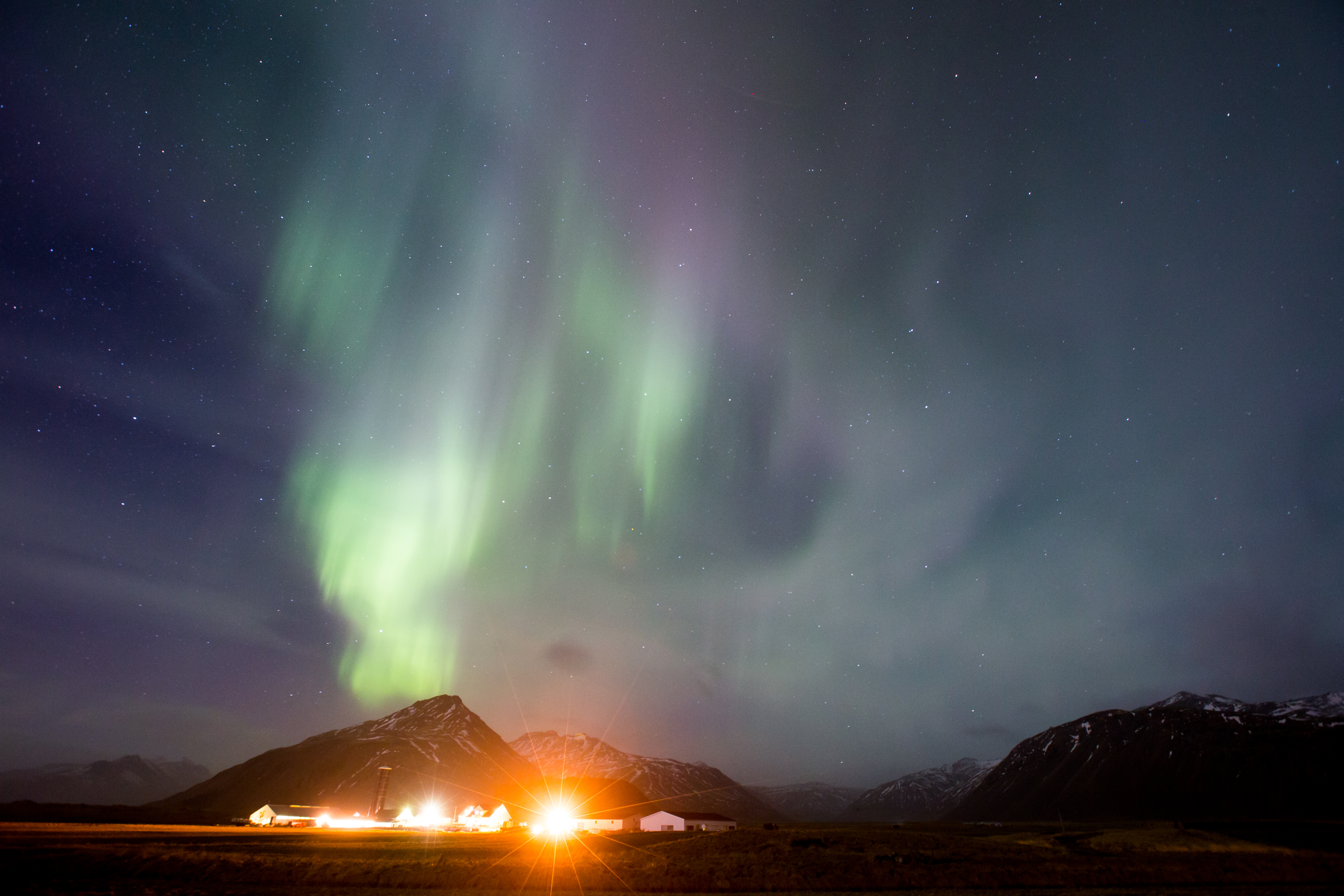 A few hours later I heard a great commotion outside my room. Out of nowhere, the northern lights were cresting the nearby mountain right outside my room. Everyone was outside my room excitedly watching this amazing and unexpected show. At first, the lights were just a dull green. Over time they grew to a more vivid green easily seen by the naked eye. As they stretched across the sky they started to dance and hues of purple started splitting from the green. For over an hour we all sat outside our rooms as we watched the brilliant display. It was such an amazing show that one of the couple promptly cancelled their Northern Lights tour that was planned for the next night.